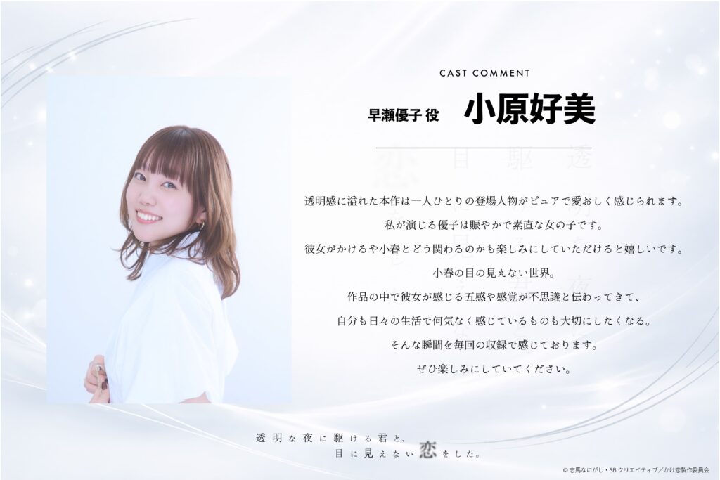 TVアニメ『透明な夜に駆ける君と、目に見えない恋をした。』メインキャストの早瀬優子役 小原好美さんよりコメントが到着!
