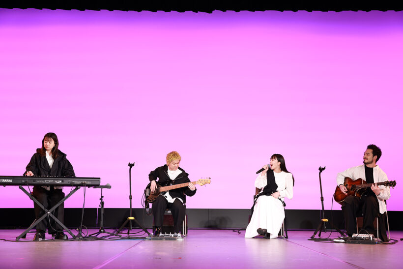 そしてイベント中盤には、主題歌・挿入歌を担当する緑黄色社会がサプライズ登場!予想外の演出に会場からは割れんばかりの歓声が上がりました。特別バージョンで主題歌を生歌唱すると、力強くも繊細な歌声がホールいっぱいに響き渡り、歌い終えた瞬間にはひときわ大きな歓声と拍手が巻き起こりました。歌唱を間近で聴いた當真さんは、思わず両腕をさすりながら「鳥肌が止まらないです」と興奮気味にコメント。「サビの歌詞が本当に好きです。この曲にものすごく背中を押していただいているような、フジコの気持ちになって聴いていました」と目を輝かせました。嵐さんは「緑黄色社会さんのイメージが、透き通るように本当にパワフルな印象なので、このフジコと千鶴の二人とどうマッチするんだろうと最初は思っていたんですけど、映像と合わせて初めて実際に聴いたときに圧倒されたのを覚えています」と感動を伝えました。