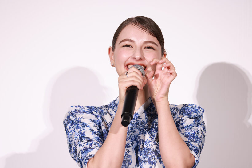 登壇時にひときわ目を引いた、キャラクターイメージでスタイリングされた声優キャスト陣の衣装。當真さんは「ポスターのフジコと全く同じ黄色」のワンピース、嵐さんは「千鶴イメージの青と白のワンピース」に「バレエの練習着と同じ色のネイル」、そして「バレエを意識した髪型」と、キャラクター要素を反映した華やかな装いのポイントを説明。松也さんは若林をイメージした白のスーツで、普段はめったにしない上下白の装いのため、監督からも驚かれたエピソードを披露しました。そして、角田さんは演じたエンゾをイメージしたパンツを着用し、名塚さんもそれにならい、ジャンヌのイメージカラーを意識したというワインレッドのロングスカートについて触れて、役に合わせた衣装で揃って登壇した喜びをそれぞれ語りました。