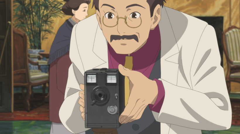 白土さん「横浜のゲーテ座で若林が持っているカメラは、明治37年に発売された「チャンピオン手提暗函」をモデルにしています。日本の国産カメラの中でも最も古いものの一つで、日本カメラ博物館様のご協力で実物を撮影させて頂きました。しかし、実際にどうやって持って撮影するかなどはよく分かりません。そこで構造や形状が近そうな当時のカメラ「Brownie No. 2」などの資料から、持ち方や撮影の仕方などを推測しました。」