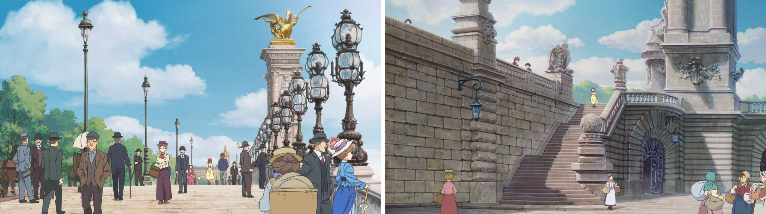白土さん「千鶴がパリを散策しているシーンに出てくる橋は、1900年のパリ万国博覧会に合わせて建設された、四隅に巨大な記念柱(ピュロン)のあるアレクサンドル3世橋。ベルエポックの絶頂を象徴するような豪華絢爛なセーヌ川の橋なのですが、次に何やら大きな船が出て来ます。これは洗濯船(Bateau-Lavoir)と呼ばれる共同洗濯場で、女性たちが川水で衣類を洗って、2階でそれを乾かす場所でした。その次のカットの右下に洗濯物をたくさん抱えた洗濯婦が描かれています。ベルエポックの絢爛たる橋でも、すぐその下に庶民の生活が溢れているという描写になっております。」