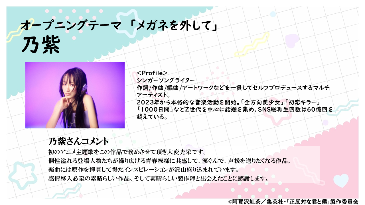 TVアニメ『正反対な君と僕』の続報は今後公式HPおよび公式Xなどで発表していきます。