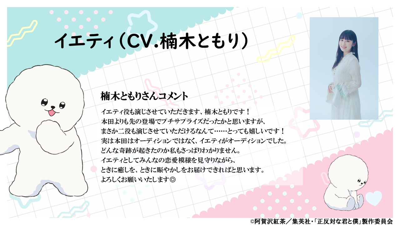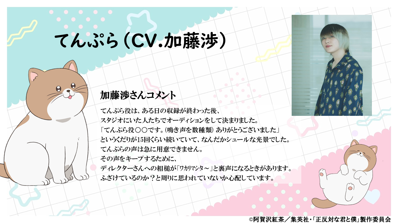 2026.01.18 イエティ役・てんぷら役のキャスト解禁! 追加キャラクター情報を解禁! 本作のマスコット的キャラクター・イエティ役を楠木ともり、主人公の鈴木が想いを寄せる谷の飼い猫・てんぷら役を加藤渉が演じます。 イエティは、本編中で回想シーンなどのナレーションを担当する進行役としても活躍。 また、加藤渉は平役、楠木ともりは本田役も務めており、ファン必見の“二役キャスト”となっています。 物語を彩るキュートな存在、てんぷらとイエティの活躍にもぜひご注目ください。